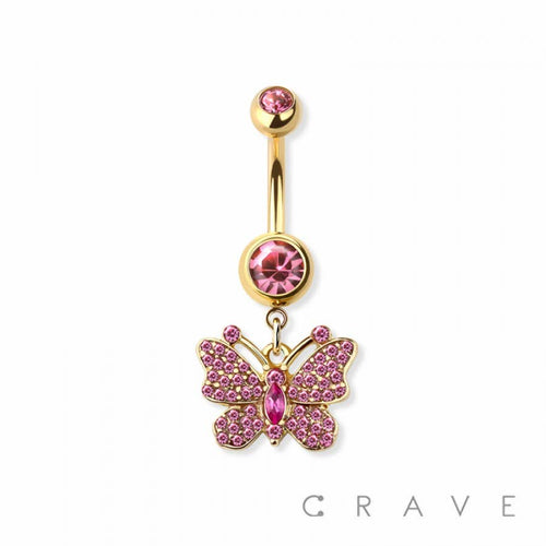 Gem Butterfly Dangle Navel Ring / Belly Button Ring. Material: 316L SURGICAL STEEL/BRASS, Thickness: 14GA (1.6MM) Length: 3/8" (10MM) Ball Size: 5X8MM
