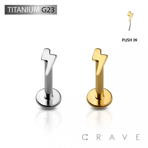 LIGHTNING BOLT TITANIUM THREADLESS PUSH IN LABRET Material: Ti 6Al-4V ELI ASTM F136 Thickness: 16GA (1.2MM) Length: 1/4" (6MM) . Crafted from ASTM F136 implant-grade titanium, rigorously tested for professional body piercing, ensuring maximum safety and user-friendly application. Ships in 1-3 business days