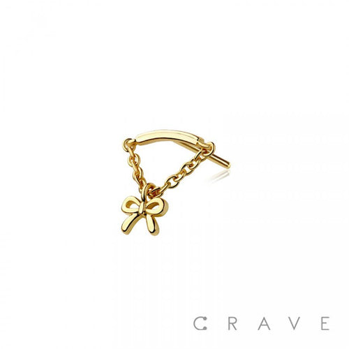 This Threadless Push In Ribbon Bow Chain Dangle Labret combines secure comfort with elegant design. Crafted for precise fit and durability, its ribbon bow detail adds a refined, delicate touch to your piercing. Ideal for those seeking a subtle yet sophisticated accessory that stays comfortably in place throughout the day.