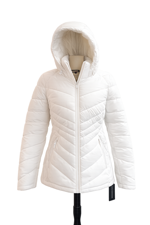 Stay warm while keeping your look effortlessly classic with this Tommy Hilfiger Women’s White Hooded Puffer Coat. Designed with lightweight insulation and a flattering chevron-quilted pattern, this coat is both functional and stylish for colder days.