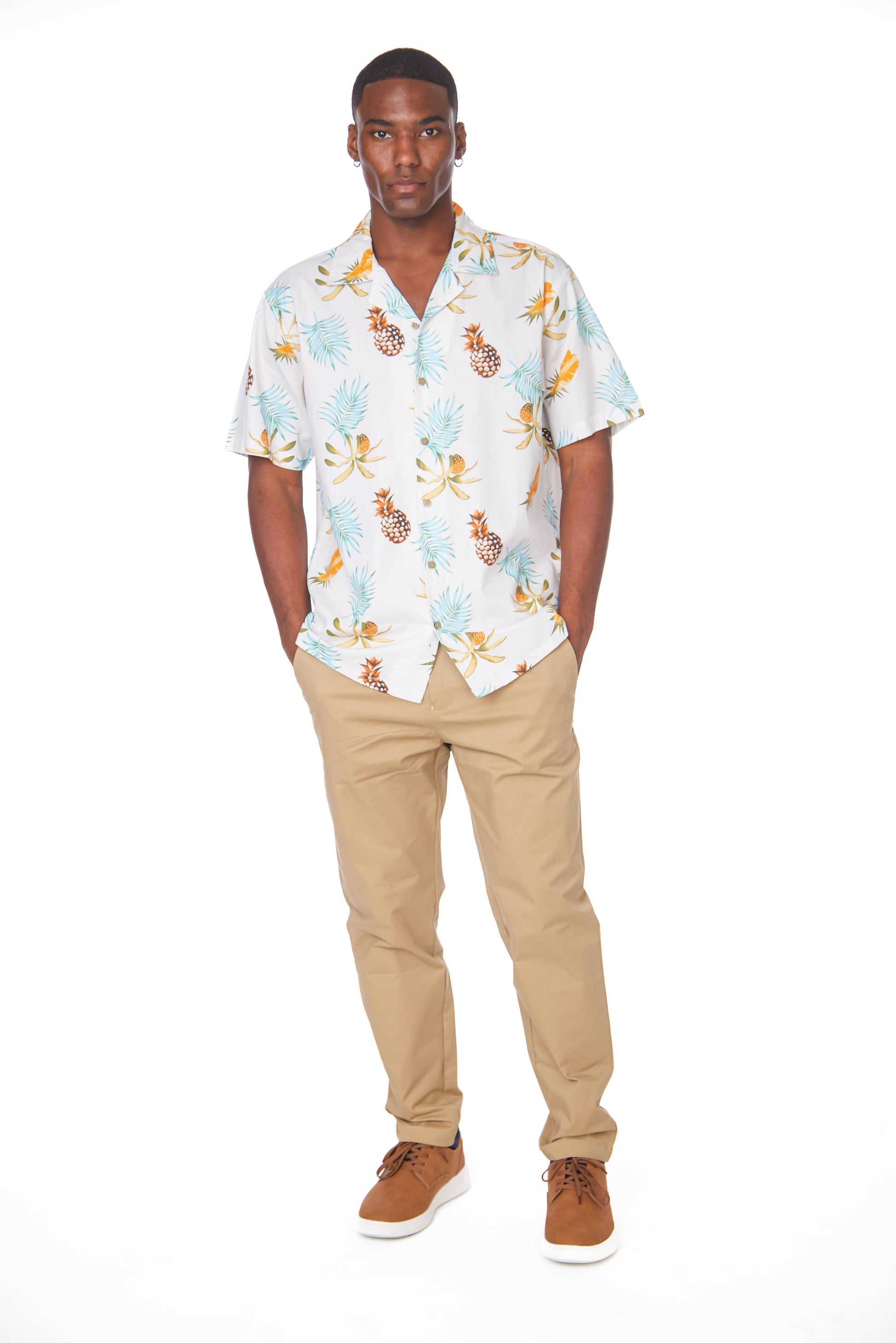 Expertly crafted for a relaxed and stylish fit, this men's printed woven short sleeve shirt features a fun pineapple print. Made with 100% cotton, it's perfect for spring and summer. Wear it with confidence, just like our 6'2" model in size M. Ships in 1-3 business days
