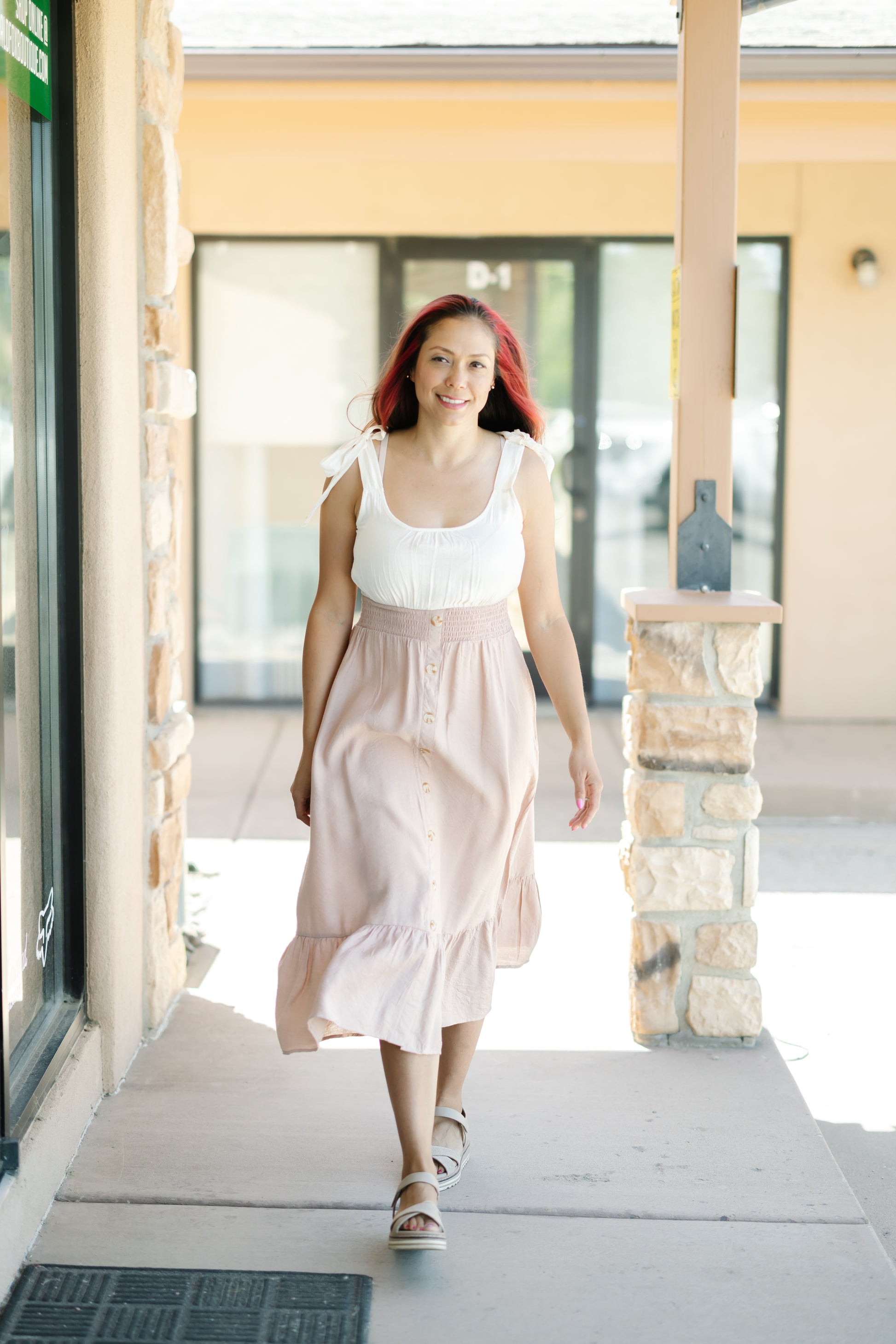 Expertly crafted with a U neckline and wide, tie-detailed straps, this Mixed Media Button Down Maxi Dress exudes sophistication. Its front nonfunctional buttons and skirt slit add subtle charm, while the 80% rayon and 20% nylon blend provides maximum comfort and style. A must-have for any wardrobe. Ships in 1-3 business daysย